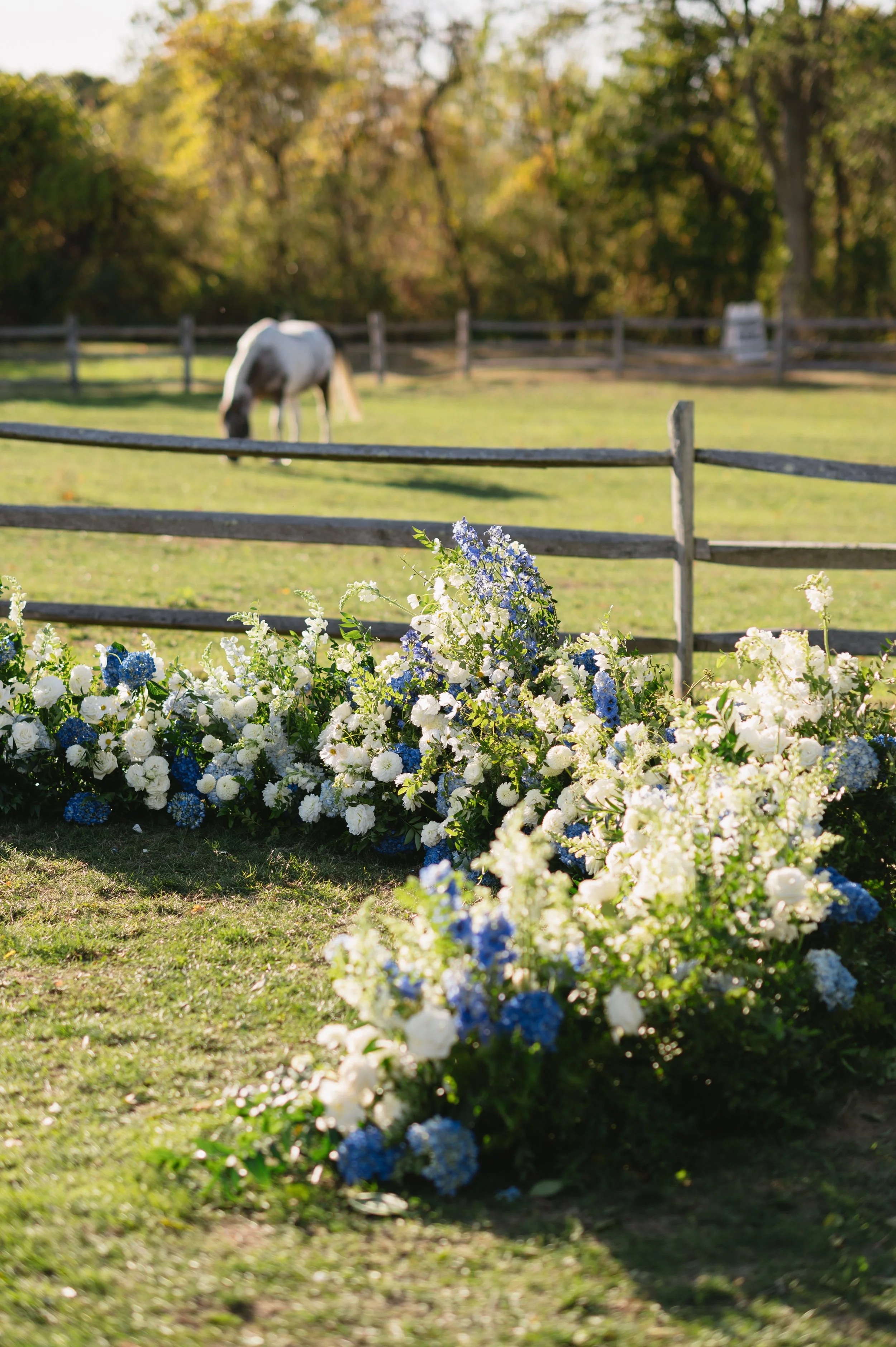 The ceremony took place in the paddock, a place held near & dear to the bride’s heart. We elevated the ceremony site with floral details that softened the fencing and grounded the space with an organic garden crest that enveloped the couple in fragrant blooms as they exchanged vows. As guests arrived, they were welcomed by the family horses. The family pup Macy even made an appearance, adorned with a lush floral collar! This attention to detail was a sweet, heartfelt nod to how important family is, both two-legged and four-legged alike.